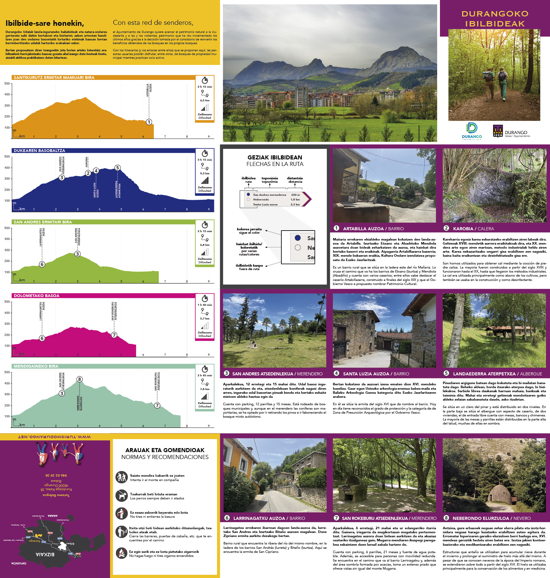 Con esta red de senderos, el Ayuntamiento de Durango quiere acercar el patrimonio natural a la ciudadanía y a las y los visitantes; patrimonio que ha ido incrementado los últimos años gracias a la decisión tomada por el consistorio de reinvertir los beneficios obtenidos de los bosques en los propios bosques. Con los itinerarios (y los enlaces entre ellos) que se proponen aquí, las personas usuarias podrán disfrutar, entre otros, de bosques de propiedad municipal mientras practican ocio activo.